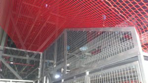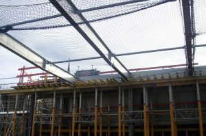 Insgesamt haben wir 1.200m² Netze und 118lfdm. Randsicherung am Stahlgerüst des Bauteils installiert. Ursprünglich sollte ein Standgerüst aufgestellt werden. Weil dieses aber mit Einschränlungen auf der Baustelle verbunden gewesen wäre, haben wir den Bauherren im Rahmen einer bauspezifischen Beratung darin unterstützt, eine alternative Randsicherung zu finden. Spontan erweiterte der Kunde den Auftrag. Als Nachtrag haben wir kurzfristig 30lfdm. Randsicherung an der Betonstruktur der Erweiterung befestigt. Mit der Randsicherung von Weglage konnte auf das Standgerüst verzichtet werden. Die Installation hat unter Einsatz einer Arbeitsbühne 2 Tage in Anspruch genommen.