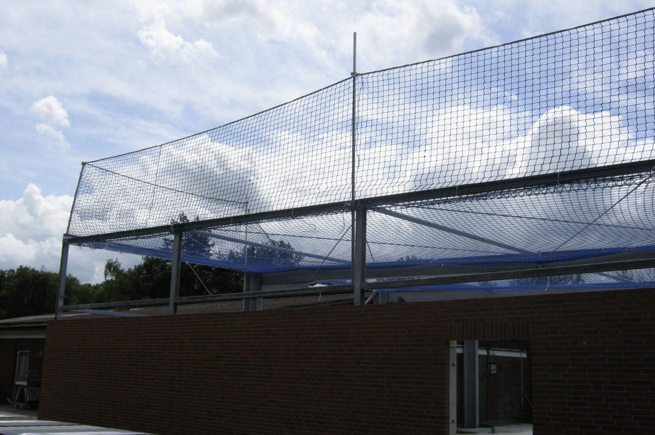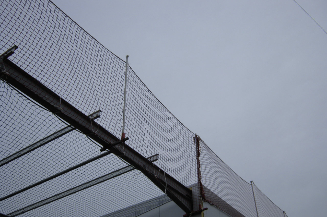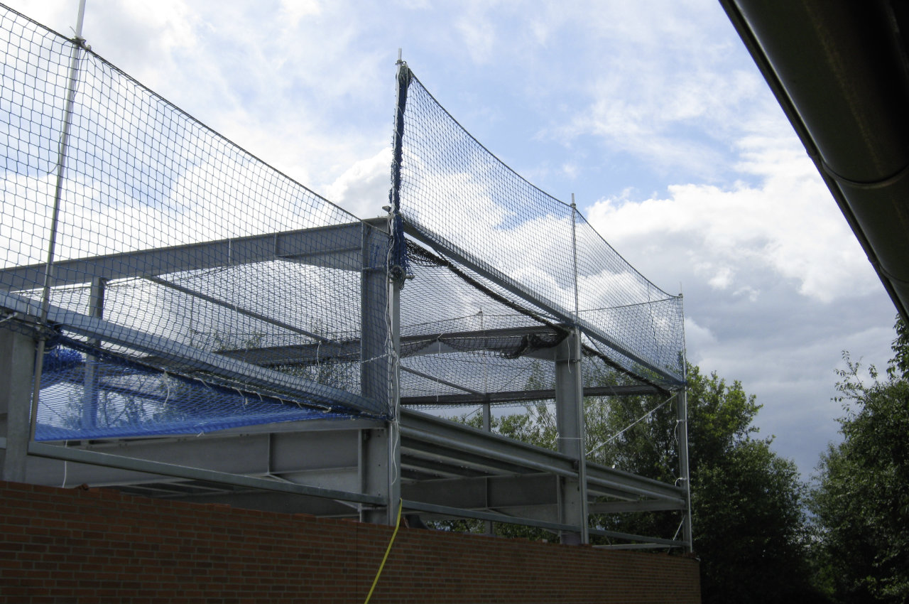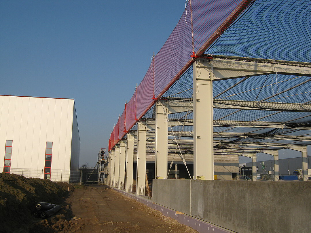 Randsicherung und Schutznetz an Stahlkonstruktion an Hallenbau