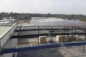Insgesamt haben wir 1.200m² Netze und 118lfdm. Randsicherung am Stahlgerüst des Bauteils installiert. Ursprünglich sollte ein Standgerüst aufgestellt werden. Weil dieses aber mit Einschränlungen auf der Baustelle verbunden gewesen wäre, haben wir den Bauherren im Rahmen einer bauspezifischen Beratung darin unterstützt, eine alternative Randsicherung zu finden. Spontan erweiterte der Kunde den Auftrag. Als Nachtrag haben wir kurzfristig 30lfdm. Randsicherung an der Betonstruktur der Erweiterung befestigt. Mit der Randsicherung von Weglage konnte auf das Standgerüst verzichtet werden. Die Installation hat unter Einsatz einer Arbeitsbühne 2 Tage in Anspruch genommen.